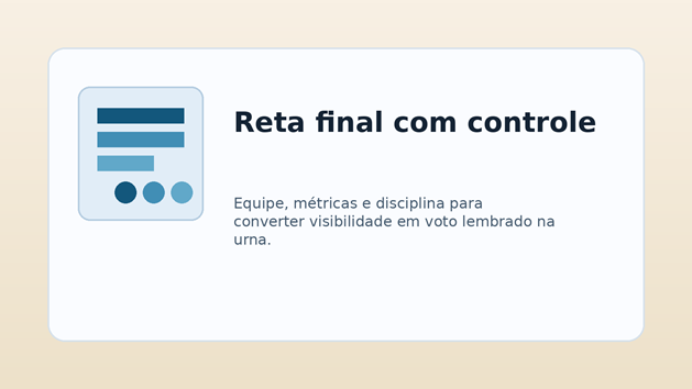 Na reta final, isso pesa ainda mais. O tempo encurta, a cobrança aumenta e cada escolha precisa ter propósito. É nesse momento que candidaturas organizadas abrem vantagem sobre as que passaram meses operando no improviso. Quem chega à reta final conhecendo seus pontos fortes, suas áreas de crescimento e suas bases de apoio consegue intensificar o que dá resultado. Quem chega sem leitura clara gasta energia demais tentando fazer tudo de uma vez.
