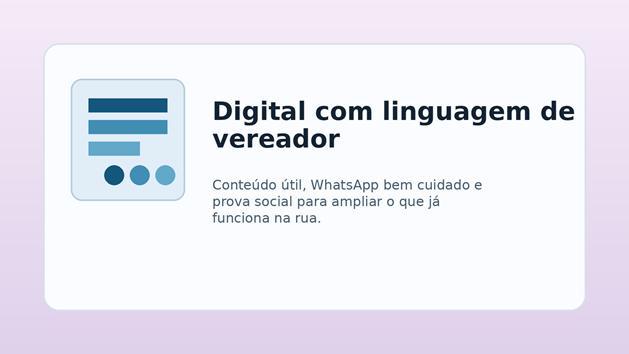 Aqui entra uma vantagem importante do vereador. Diferente de cargos mais distantes, ele pode mostrar rotina local com muita concretude. Fiscalização, visita de bairro, fala de tribuna, reunião comunitária, devolutiva de demanda e explicação de projeto rendem conteúdo autêntico. Quando a campanha entende isso, deixa de copiar fórmula de influenciador e passa a ocupar um lugar próprio. O perfil deixa de ser vitrine e vira instrumento político de relacionamento e memória.