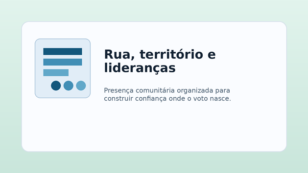 Quando essa presença é organizada, ela constrói autoridade. Não aquela autoridade de pose, mas a autoridade de quem domina pauta local e tem densidade comunitária. Muita campanha usa rua como cenário de foto. Eu prefiro usar rua como laboratório político. É ali que o candidato testa narrativa, mede recepção, fortalece base, gera conteúdo autêntico e encontra multiplicadores. Sem uma operação territorial bem desenhada, o digital perde raiz e a campanha fica parecendo distante.