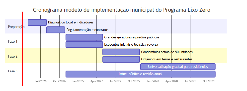 Na prática, seu PL municipal deve fazer duas coisas. Primeiro, instituir o programa e seus instrumentos. Segundo, obrigar a administração a apresentar um plano de implementação com metas e prazos, alinhado com o PMGIRS quando existir.