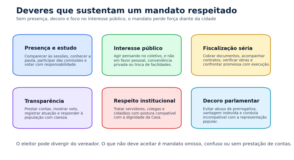 Se os direitos dão sustentação institucional, os deveres dão medida moral e funcional do mandato. É aqui que a conversa fica mais séria. Porque o cidadão até tolera divergência política. O que ele não tolera é descaso. Vereador pode pensar diferente. O que não pode é tratar a cadeira como enfeite, salvo-conduto ou trampolim vazio.