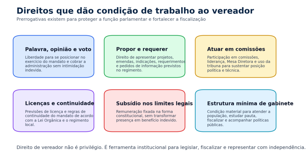Há ainda direitos ligados à continuidade do mandato, como hipóteses de licença por saúde, interesse particular dentro dos limites legais e, conforme a norma local, licença maternidade e paternidade. Em várias câmaras, também há regramento sobre subsídio, descontos por ausência injustificada e condições materiais mínimas de funcionamento do gabinete. Esses pontos variam conforme a legislação municipal, mas fazem parte do ambiente de garantias do exercício parlamentar.