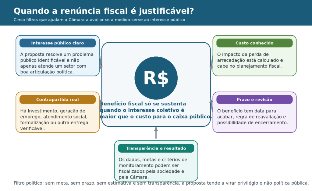 Em matéria social, também é possível enxergar casos defensáveis. Um benefício voltado a determinada finalidade pública, com público-alvo bem definido e impacto controlado, pode ter razão de ser. O ponto central é não tratar o argumento social como passe livre para abrir mão de receita sem cálculo. Quanto mais nobre a finalidade, maior deve ser o cuidado com o desenho, porque o discurso tende a desarmar a crítica.