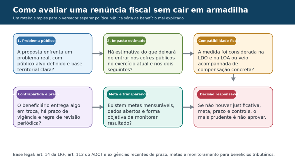 A Lei de Responsabilidade Fiscal trata esse tema com objetividade. A concessão, ampliação ou prorrogação de incentivo ou benefício tributário que gere renúncia de receita exige estimativa de impacto orçamentário-financeiro no exercício em que a medida começa e nos dois exercícios seguintes. Além disso, a proposta precisa atender ao que a lei de diretrizes orçamentárias manda. Esse já é um filtro importante para qualquer vereador que não queira votar no improviso.